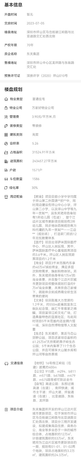 東關集團所開發的坪山江邊片區城市更新項目,位于深圳市坪山區馬巒街道江嶺路與比亞迪路交匯處西北側,項目分三期開發建設,擬建成集商品住
